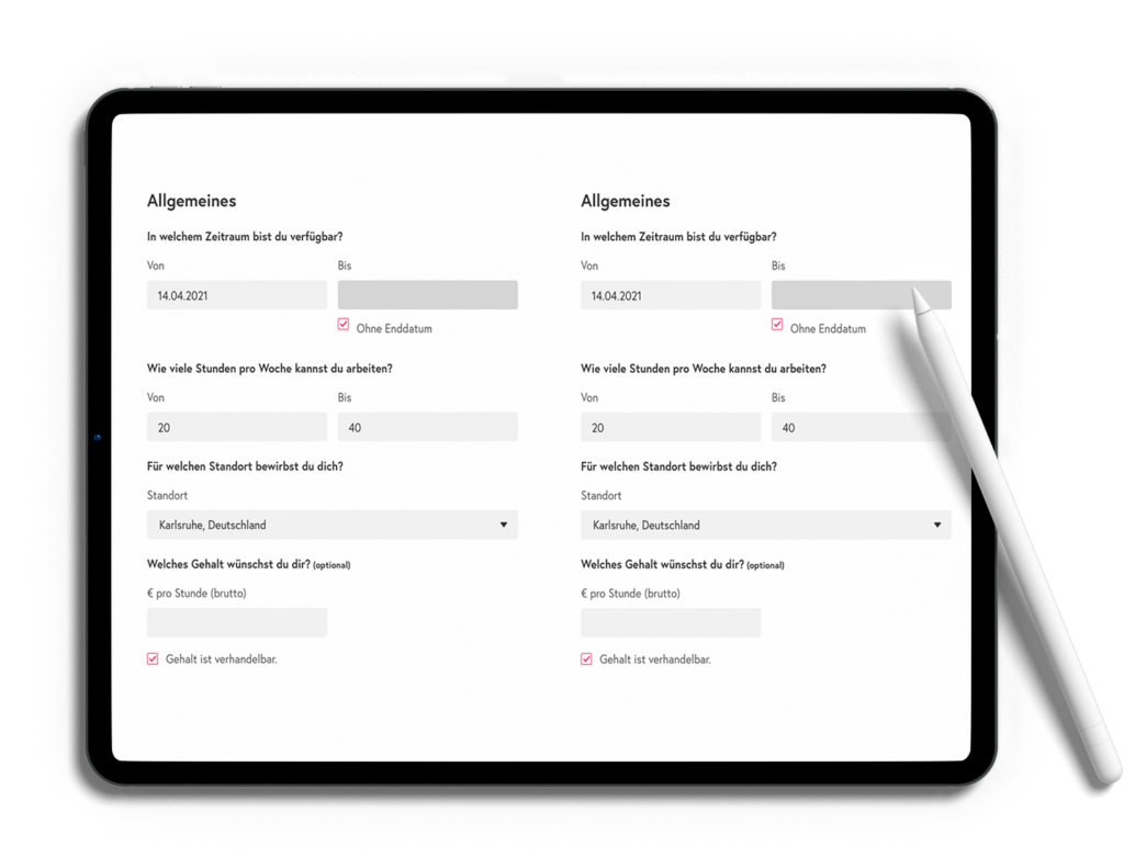 Zu allererst kannst du dich bei uns auf der Website direkt bewerben. Entweder bieten wir dir die Möglichkeit, dich auf eine bestimmte Stelle zu bewerben oder uns eine Initiativbewerbung zu schicken.